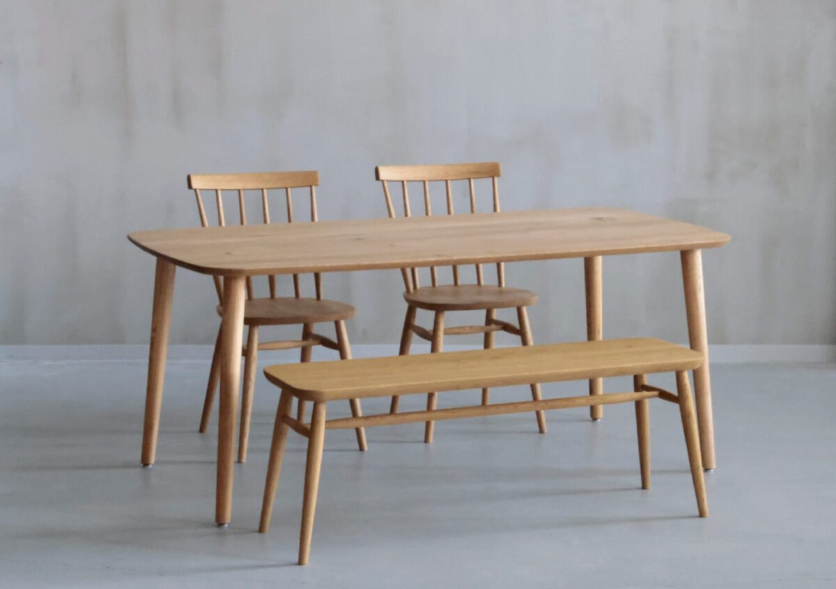 オーク材のあたたかさと、チェアの上品なカラーリング。どちらも主張しすぎず、お互いを引き立て合うデザインのバランスがこのセットの大きな魅力です。ダイニングを「食事の場」から「心地よく過ごせる空間」へとアップデートしたい方におすすめの組み合わせです。