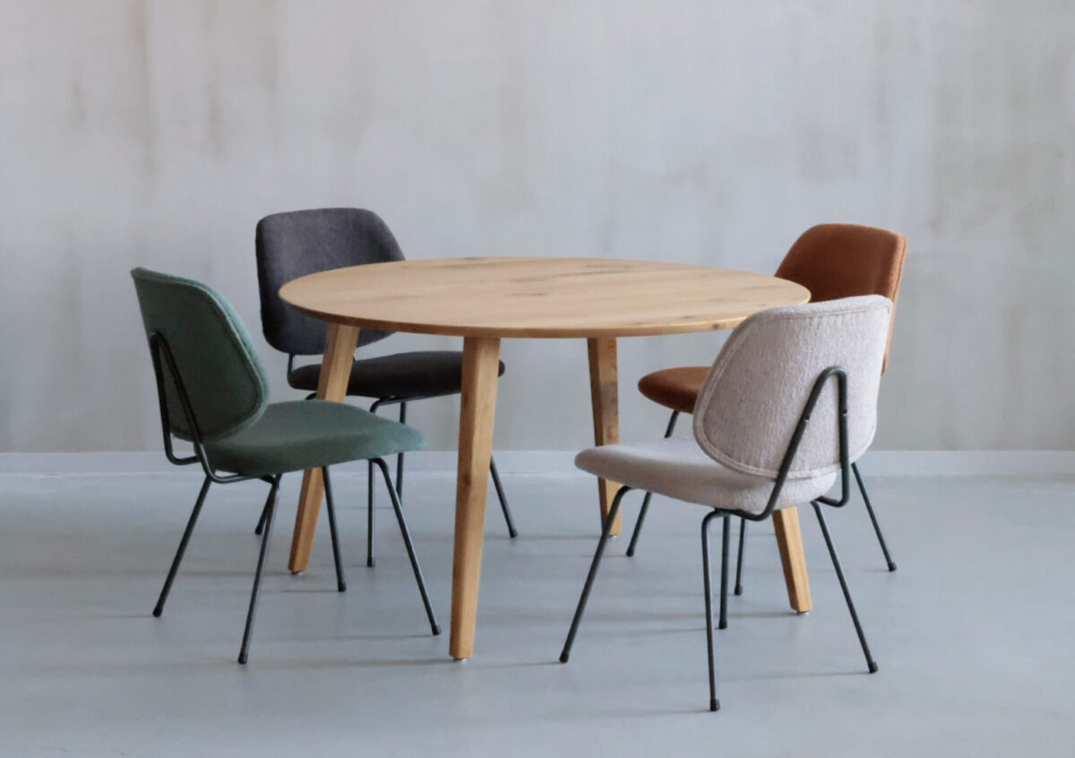 多くのお客様から支持を集める定番コーディネートが、このオーク材の丸テーブル「ミース ダイニングテーブル」と「アボック チェア」の組み合わせです。