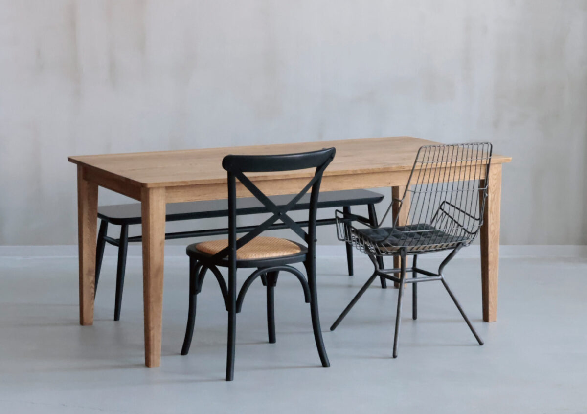 合わせるチェアには、背もたれのクロスデザインが印象的な「クロスバック チェア」と、異素材の組み合わせが魅力の「キャシー チェア」を選びました。木の質感と異素材の組み合わせによって、単調にならず、空間に奥行きとリズムが生まれます。