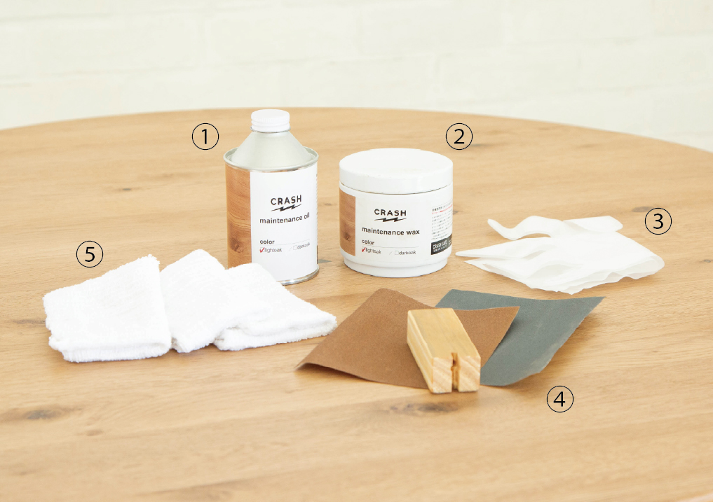 ③ビニール手袋 ④サンドペーパー(180番/220番) ※当木を使うことでより効果的です ⑤ウエス(Tシャツの端切れ)