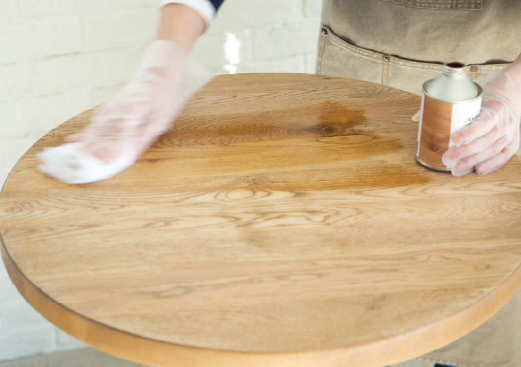 ウエスにオイルを染み込ませ、木目に沿って表面・側面をムラなく塗ります。