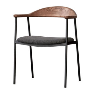 背から肘にかけてなめらかな曲線を描く木部とスチールフレーム、ファブリックの異素材の組み合わせが個性的なチェア。無駄をそぎ落とし洗練されたフォルムに、優しい天然木の雰囲気が見事に調和しています。