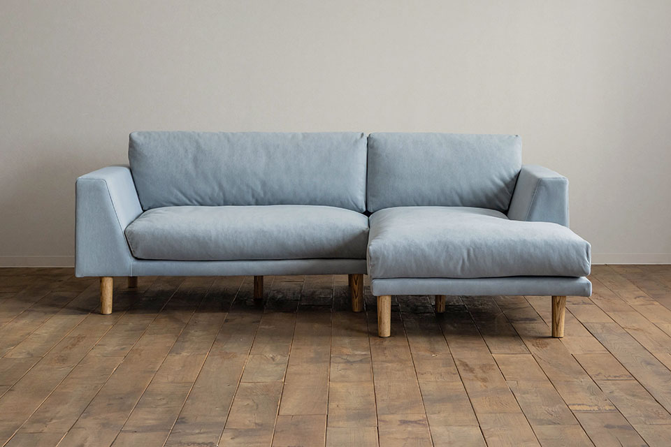スタンダードなデザインのカウチソファ。圧迫感を抑えるため、背もたれを低めに設計。視線を遮らず空間を広く見せてくれます。