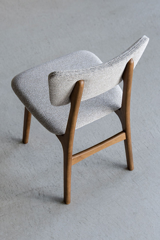 木部のフレームは無垢材を贅沢に削り出し、角を取って丸みを持たせ、優しい手触りに仕上げています。また、木部は落ち着いた色合いの味わいのあるブラウンに着色することで、座面や背もたれのファブリックとも調和し、まとまりのある上質でシックな雰囲気を演出します。