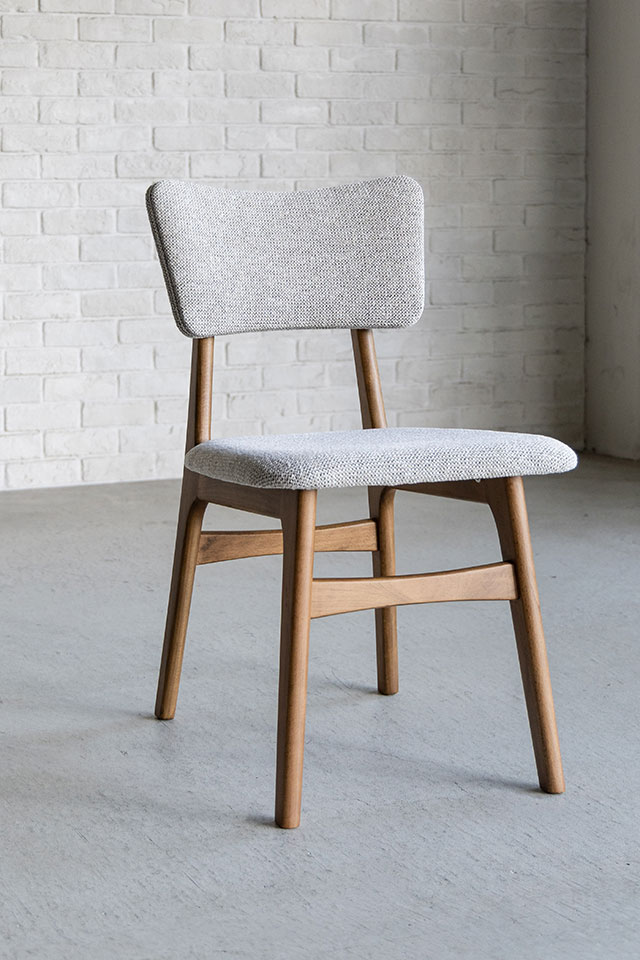 シンプルなシルエットのチェア。背もたれと座面には、シックで柔らかな質感のファブリックを張り込み、カジュアルな印象を演出。